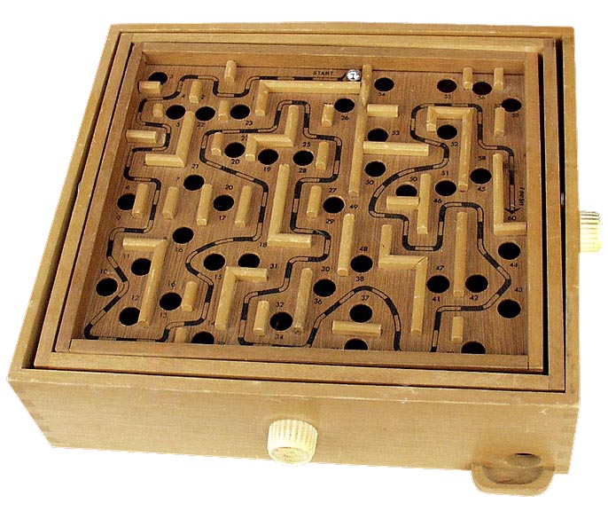 Dominoes and the wooden Labyrinth were my favorite games when I was young. Many hours were spent building and destroying domino structures, but I didn’t really like them as a competitive game; they were more of a toy to me. The “domino effect” required both double-nine and a double-twelve sets to be worthwhile. PATHFINDER was a maze game that I got at the same time my brother Tim got COLOMBO and Tom got WILDLIFE. Tom is now a biologist for the Forest Service, so I guess Tim needs to be a detective. The Pachinko game really got me into mechanical problem solving (it was constantly getting jammed). Those Japanese characters on the ball bearings were so cool!