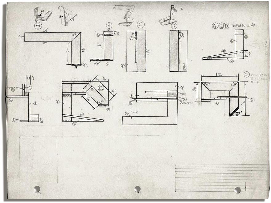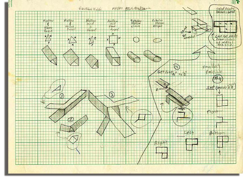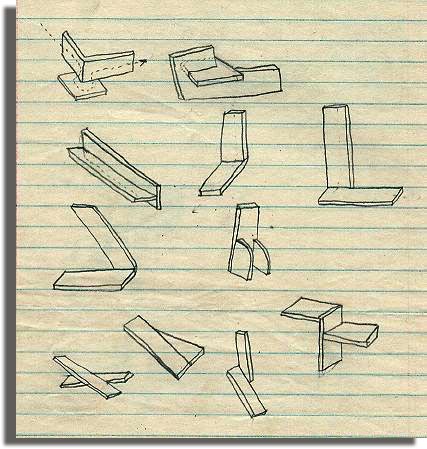 Slowly, the concept of component pieces began to form. What are the essential concepts? I considered the idea of making them from thin metal sheeting. If the design was right, the whole thing could be cut out in a single piece and bent into shape. The left drawing describes basic tubular structures and bends. The middle picture describes basic transitions from one plane into another. To the right, a few tool designs for making multiples in metal, all by hand.