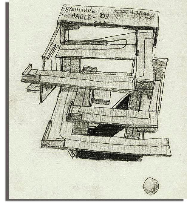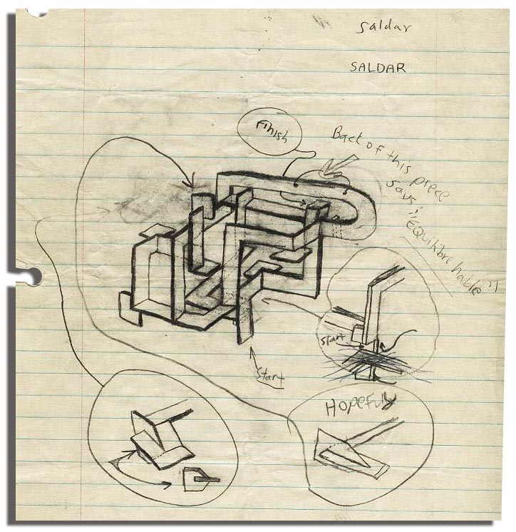 It was time to come up with a completely new design. Remembering how difficult it was for me to make the original balsa model, I tried to work it out entirely in drawing form. My lesson about building physical models to solve problems was not yet learned, so I never built this version physically. The same problem was cropping up in my mind again: Equilibre Hable is not a single design, but rather a concept. This version was called SALDAR, and I don’t remember why.
