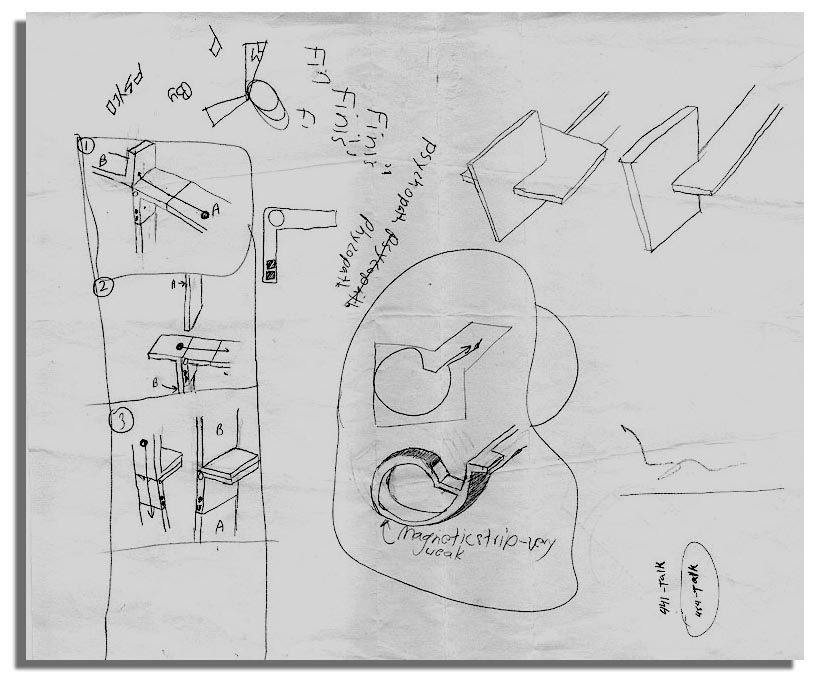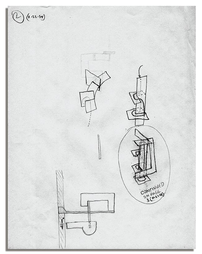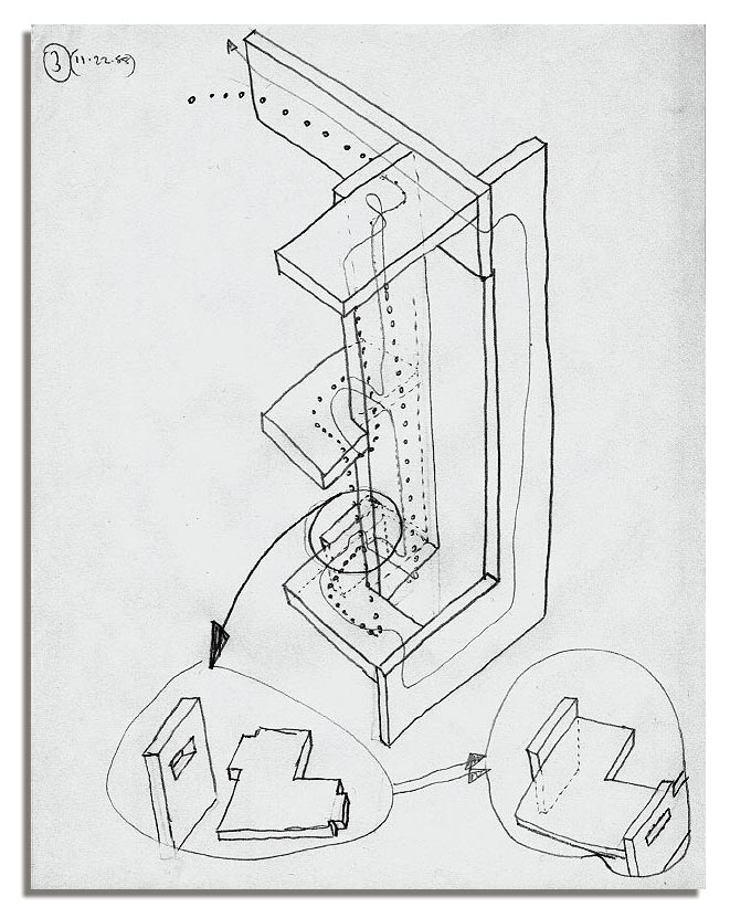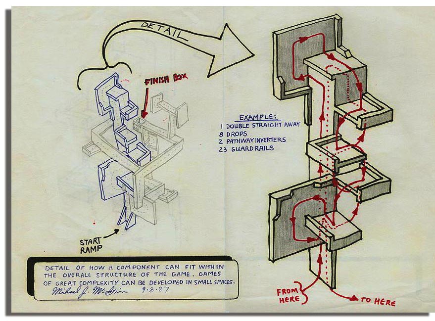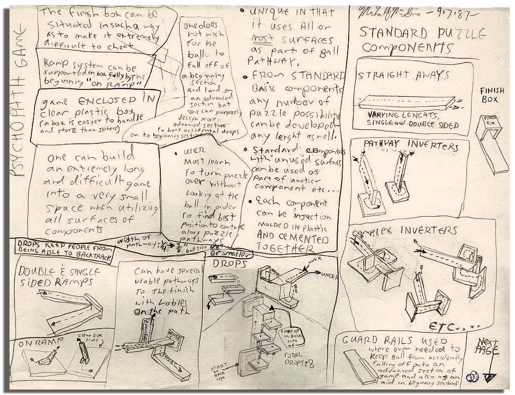 I think Penny may have suggested creating a proposal for the game. At any rate, it was again time to redesign. The latest version would contain two discrete “mazes” intertwined, or at least disconnected from one-another. The ball would fall from one unit onto another. It was very difficult to visualize. I was afraid of making a model because I had no shop, tools, or space. But I did have a borrowed Apple Computer. So with very few sketches, I created a 3-D model. It was so time-consuming that I only completed one of the units. I thought the accuracy of the computer could directly translate to manufacturing processes. Not true. As seen in the design proposal below, I eventually drew the other unit without modeling it in 3D.