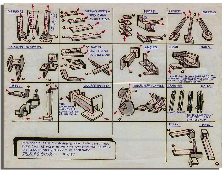 Thinking again about component pieces, I finally began to define the basic elements: on ramps, straight-aways, drops, pathway inverters, complex inverters, single and double sided ramps, angles, guard rails, tunnels and tubes, transfer rails, and finish boxes. One could even design a game with multiple pathways; for beginner, intermediate, and expert. Injection molded plastic parts could be cemented together. It occurred to me that, “a box is easier to handle and store than a sphere”. (Looking back, I can now see how the cube informed rectangular and straight designs, and the sphere, which is more difficult to design into, informs arcs and circles.)