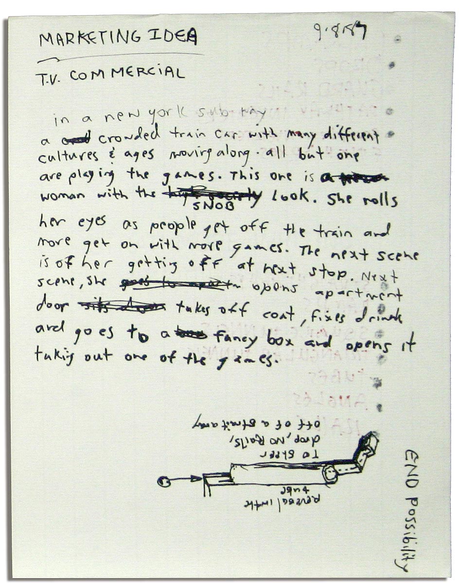 Several TV commercial ideas came to me. Here’s one, “in a New York subway a crowded train car with many different cultures and ages moving along. All but one are playing the games. This one is a woman with the snob look. She rolls her eyes as people get off the train and more get on with more games. The next scene is of her getting off at the next stop. Next scene, she opens apartment door, takes off coat, fixes drink and goes to a fancy box and opens it taking out one of the games”.