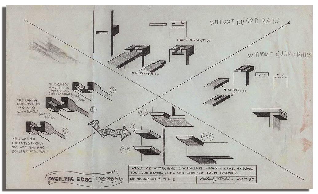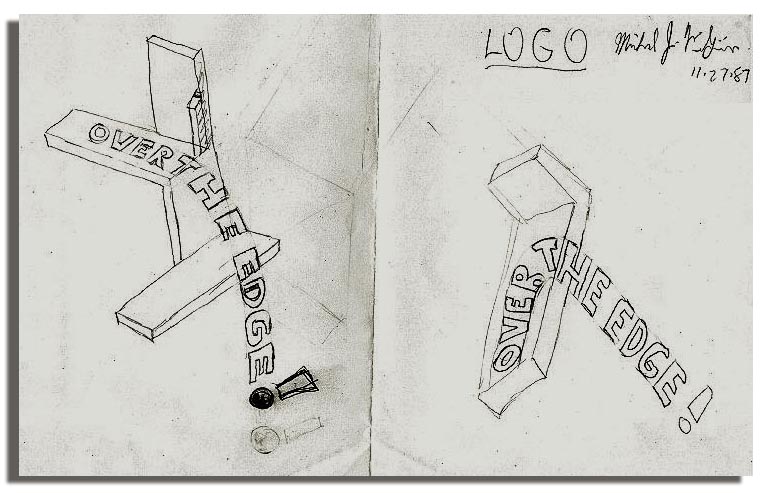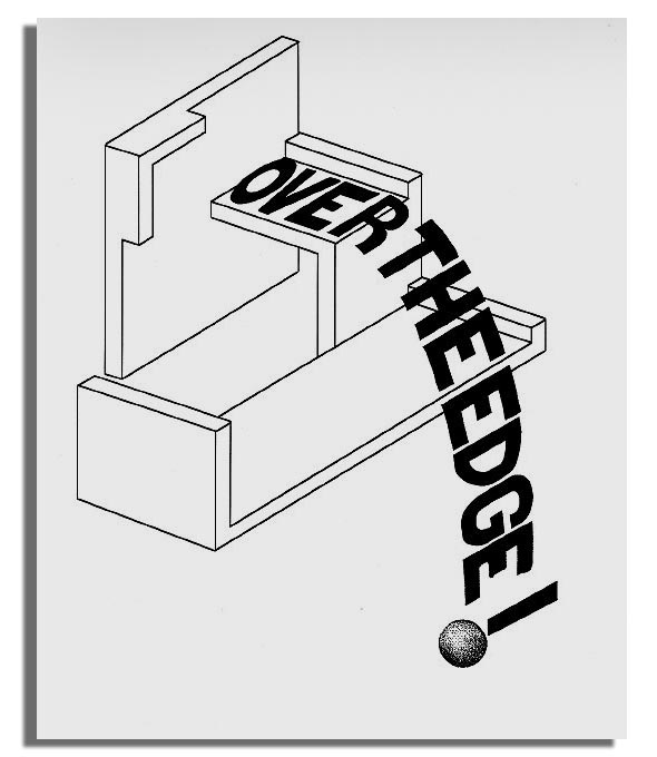 For me, teaching even one class was an all-consuming task. Luckily, the Thanksgiving holidays afforded time to work on the game... and to change the name. OVER THE EDGE was friendlier, and had a similar double-meaning as PSYCHOPATH. “This game will drive you Over The Edge!” The first “pivot” design came to mind, along with a magnetic strip allowing the ball to roll “upside-down”, and better ways to attach the game to the cube. Snap-fitting parts together could eliminate cementing. The refined logo image (to the right) was actually produced on a computer 14 months later for the design proposal described at the bottom of this page.