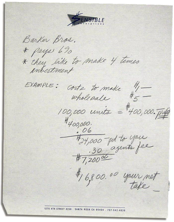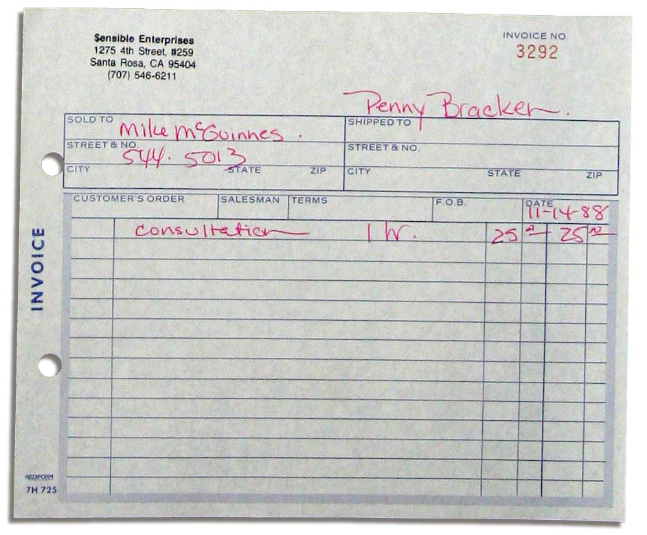 The ISC report was useless, so on the advice of our friend, Greer Upton (spouse of John Watrous), Becky and I met with Penny Bracken. She had a consulting business called “$ensible Enterprises”. Penny hoped to help us get the game marketed. For a fee of $25 (one hour), Penny gave us some example royalty figures and a contact with a possible investor named Joe Pascoe. If we made a license agreement, she would take 30%.