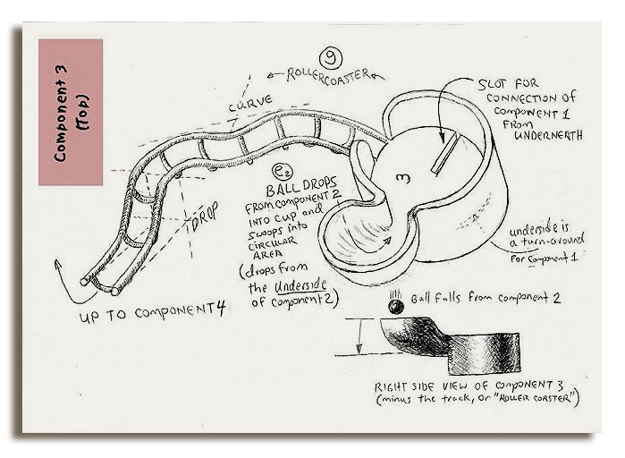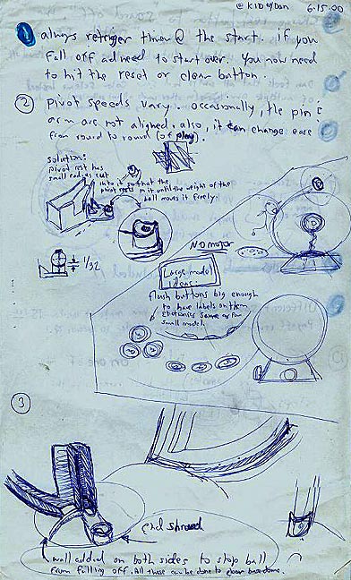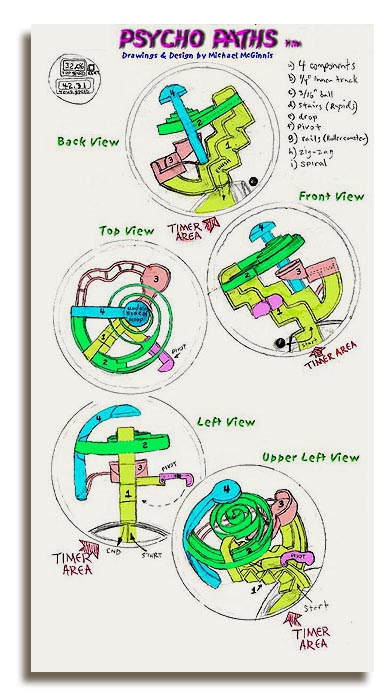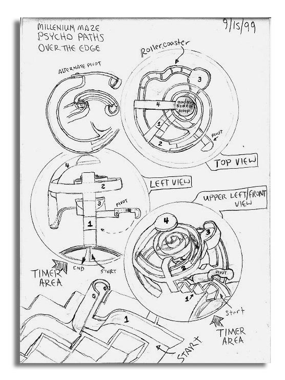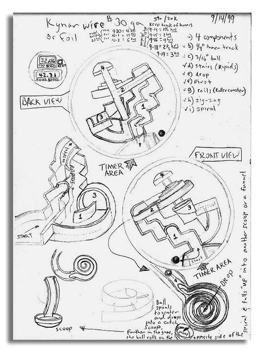 “PSYCHO-PATHS” was meant to be easy to play with high railings nearly everywhere. There was going to be a timer on the bottom, allowing the player to test their speed and dexterity, rather than dexterity alone as with so many of the previous versions. I resisted the timer. It was a concept I thought about from the earliest days, but felt ill-at-ease with. The deep-down motivation expressed by KID regarding the timer was that the game would be marginalized unless it was placed on the electronics isle at the toy store. I naively thought the timer would fit within the small void in the base, flush with the exterior of the sphere. My perspective was from having taken apart cheap digital watches as a kid. Those electronics were very small. As seen in the first sketch on this page, I wanted two LCD screens listing the top score and current speed.