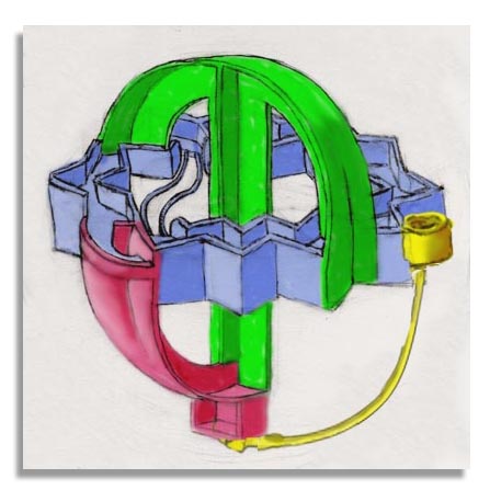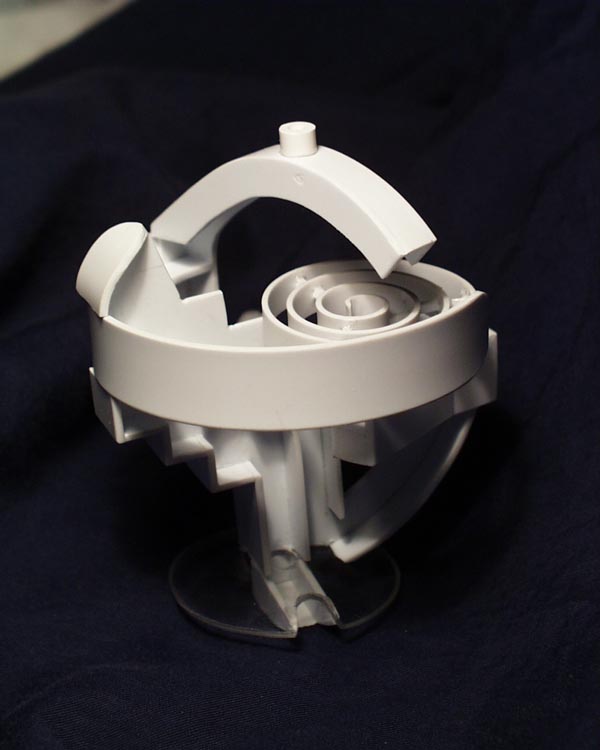 I’m intrigued by both concepts: larger/different. I’ll put some thought into it before our meeting. It would be wonderful to make the Superplexus! The model can be rolled in the stand like a mouse trackball. Thinking differently... lots of complex pivots at different angles and relationships... carrying the ball in unpredictable (but defined) paths... or something else that moves along instead of a ball, like a barbell form or weighted and inverted “U” shape.... Interesting!