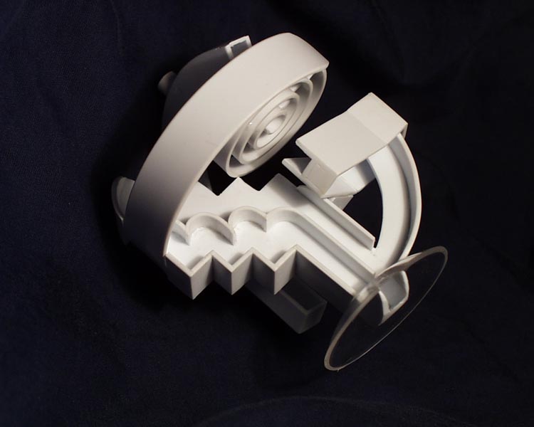 I was given three days to build the model. On Thursday evening after work, I put in four hours. On Friday, another fifteen. And on Saturday, after six more hours, the model was finished. As with the last two game models it was built from styrene. The sphere came from a Christmas tree globe kit purchased at a craft store.