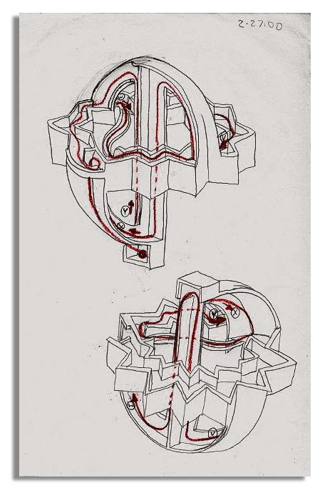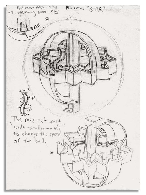 Way back in October of 1999 after I finished sketching the original “PERPLEXUS”, I began to work on a new spherical model, which I initially called “Doozie”, then “Star Track", and then finally, “PERPLEXUS STAR”. So in February, I used this as a starting point for a discussion about a second model. This version did not get past the drawing stage.