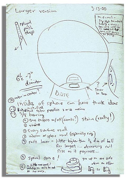 I was quite excited, not knowing how the future would unfold. The possibilities were huge. It was time to come up with the first design to fit into a 4″ sphere. Stewart gave me only three days to provide preliminary drawings. Very nerve wracking, and not nearly enough time to revise, improve, or even work out a really good solution, but I could not see this reality at the time. KID and I came up with a list of basic elements to incorporate into it: