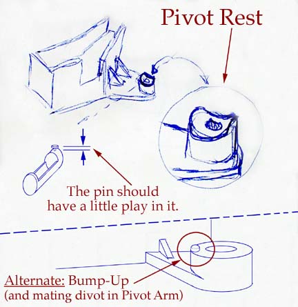 - Pivot speeds vary. Occasionally the pin and arm are not aligned. Also it can change ease from round to round of play. Solution: pivot rest has small radius cut into it so that the pivot rests on it until the weight of the ball moves it freely.