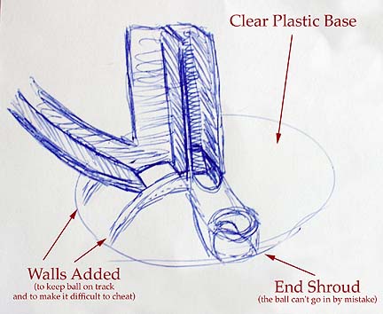 - The FINISH exit needs to be made so the ball can’t easily go into it from the exit. This can be accomplished easily by making a short raised "tube" rather than the open cut area as is now on the START and FINISH. Please see attachment, “finish_design.jpg”, below.