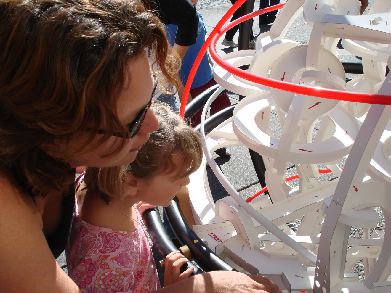 We were mobbed nearly continuously for the length of the faire. People of all ages steadfastly attempted to play through Circles, while respectfully handling its delicate form. I allowed visitors to handle many of my hand-made Perplexus prototypes, and had long discussions with many wonderful makers. I should have expected that some would want full plans of how to build their own Superplexus Circles, but I was not at all interested in this, as I was just embarking on my own artistic journey, and my piece was not a whim of fancy. My niece, Meg, and her now-husband Eddie, who lived nearby, assisted with manning the exhibit for several hours, which was essential and very welcome given the amazing crowds.