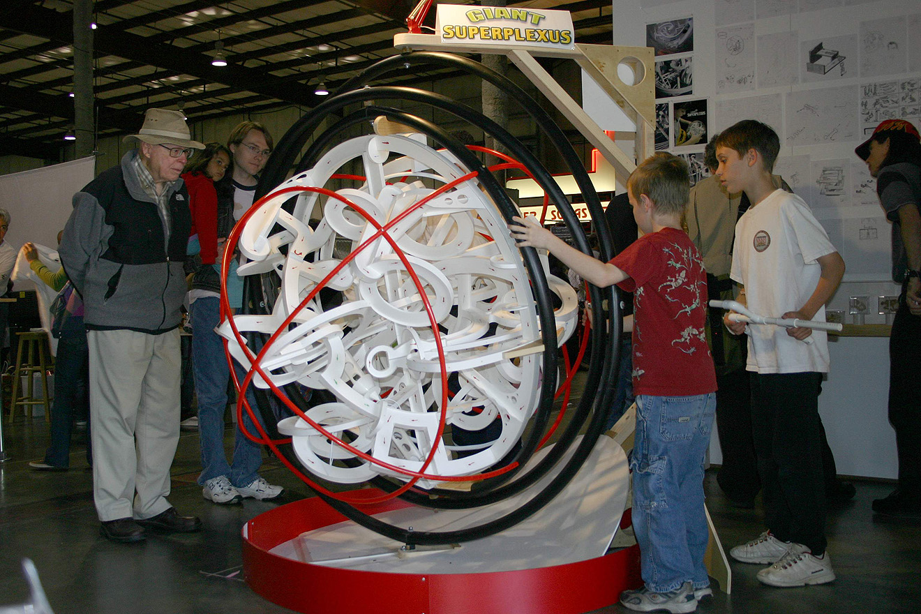 Also referred to as GIANT SUPERPLEXUS, Superplexus Circles was my first large-scale work in this new genre. It was built as a test in response to an invitation by Mark Frauenfelder, the Editor in Chief of MAKE MAGAZINE. He asked me to showcase the development of Perplexus at the 2007 Maker Faire. Mark contacted me on April 1st, and the faire took place on May 19th and 20th in San Mateo, California, which meant I had a month and a half to prepare. This opportunity gave me an idea: why not tackle my dream of creating a super-complex, human-scale interactive piece? Up to this point, I was fearful of what it would take to even begin such a project, but the invitation gave me the bravery (and deadline) to go for it.