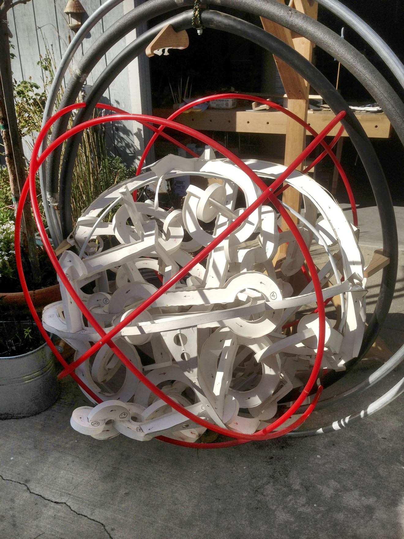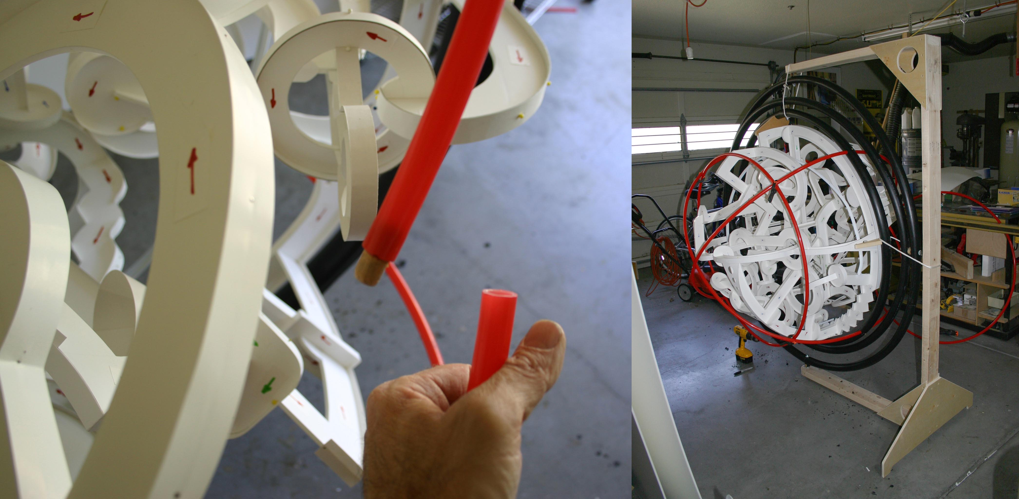 Finally, I added some red PEX tubing (left over from our radiant heating system) and created a cage to protect the pathways from direct handling. The red color helped define the outer region of the spherical form, acting like a “Do Not Cross” line, and a handle for manipulating Superplexus Circles.