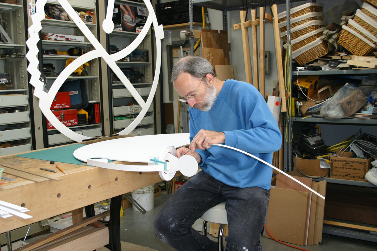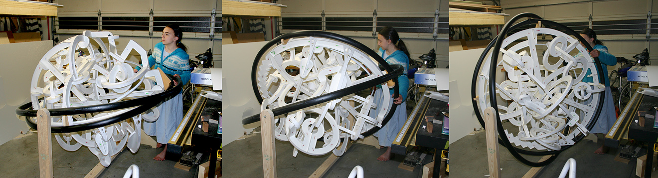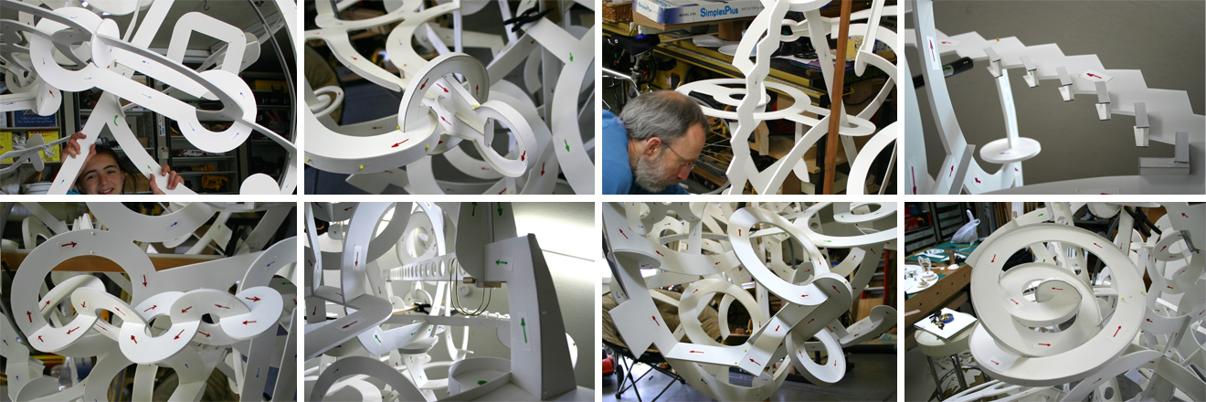 Each new plane added form to the structure. The names were growing: Dog Bone, Enterprise, Double-Donut, Steps, Tight Rope, Carriage, Rings and Non-Planar Spiral. It was taking shape as a spherical volume, but was still unresolved. Other processes were necessary to make it an interactive piece. During this stage, I received a visit from my pal, John Watrous, a great friend and mentor since enrolling in his seminal 1981 sculpture class. Out of concern for my well being, he suggested the work needn’t be so complex. As a pure art object, he had a point. It would have been formally strong even in much simpler arrangements. Much as I appreciated his insight, I had a vision,and felt the need to produce a seriously involved piece; a tours de force.