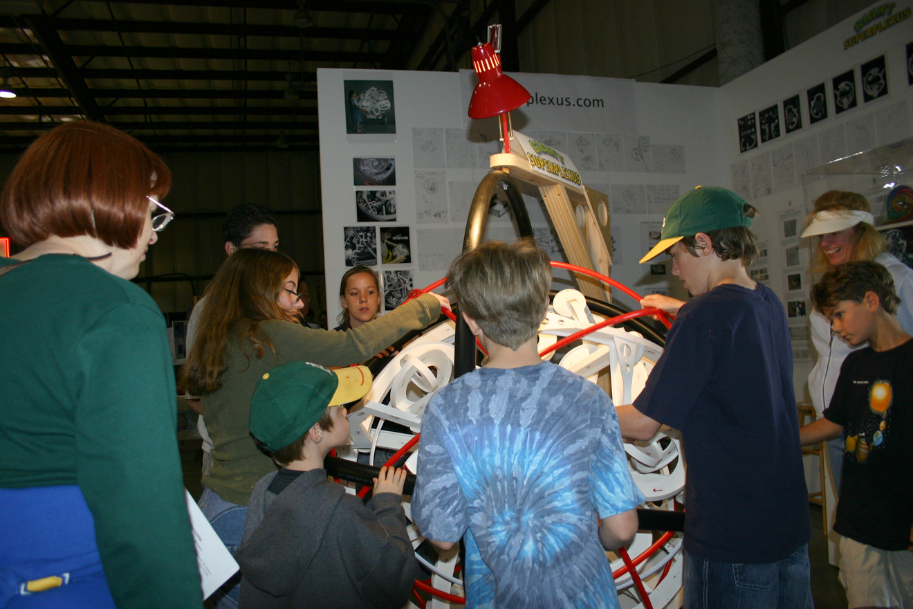 Exhibitors from the Exploratorium came by, one after the other, and expressed great interest in acquiring a Giant Superplexus for the museum. In fact, one of the exhibit builders suggested that he could work with me to build the piece robustly in PVC if I liked. Alas, an entrenched and ancient supervisor came to visit, with a dubious gaze, and asked what kind of educational value this thing had. I was exhausted from the long event, and flummoxed by his attitude, blowing the interview. I should have told him that its complexity helps people gain spatial awareness, grasp the interconnectivity between form and structure, wonder at the relationship of surface area to volume (this feature allows my 3D labyrinths to have great path length), witness the result of mapping and folding, and experience the joy of spontaneous cooperative play. These are things I have discovered myself. I am not a scientist or mathematician. However, I am an educator. Despite the curmudgeon, the Maker Faire was a rousing success! One particularly memorable moment was when a group of youngsters was working as a team to thoughtfully manipulate the Superplexus. I thought it was great that these siblings worked so well together. It turned out none of them knew each other at all!