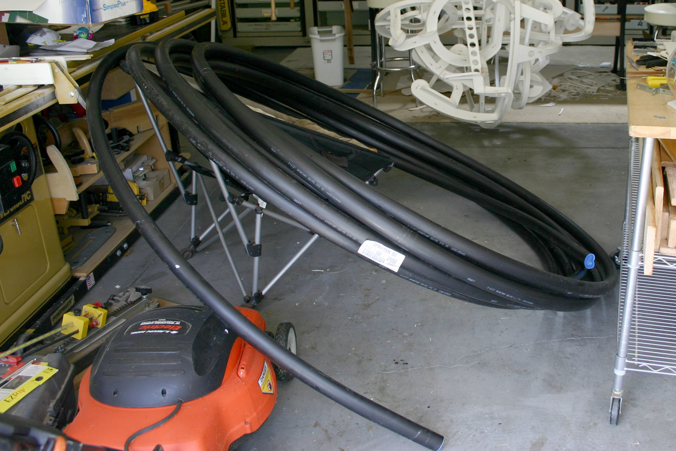 It was time to make a gimbal. Without it, I could only surmise playability. I had no experience making a gimbal and had little to go on, but figured that two rings would create full freedom of movement with one ring inside the other pivoting perpendicularly to each other. In this way, the pathway structure might move freely. It was very intimidating figuring out and locating materials for rings, pivots, and the overall structural support. My desire was to make the gimbal very light weight, and figured that plastic tubing would be ideal. Scouring the internet and local hardware stores, I eventually found a 100′ roll of 1.5-inch ID black Polyethylene pipe normally used for irrigation. It was very light, and somewhat flexible, and already in about a 5′ diameter roll, so shaping it into large rings seemed plausible. The size of the pipe seemed suitable because it was rigid enough to maintain its ring form.
