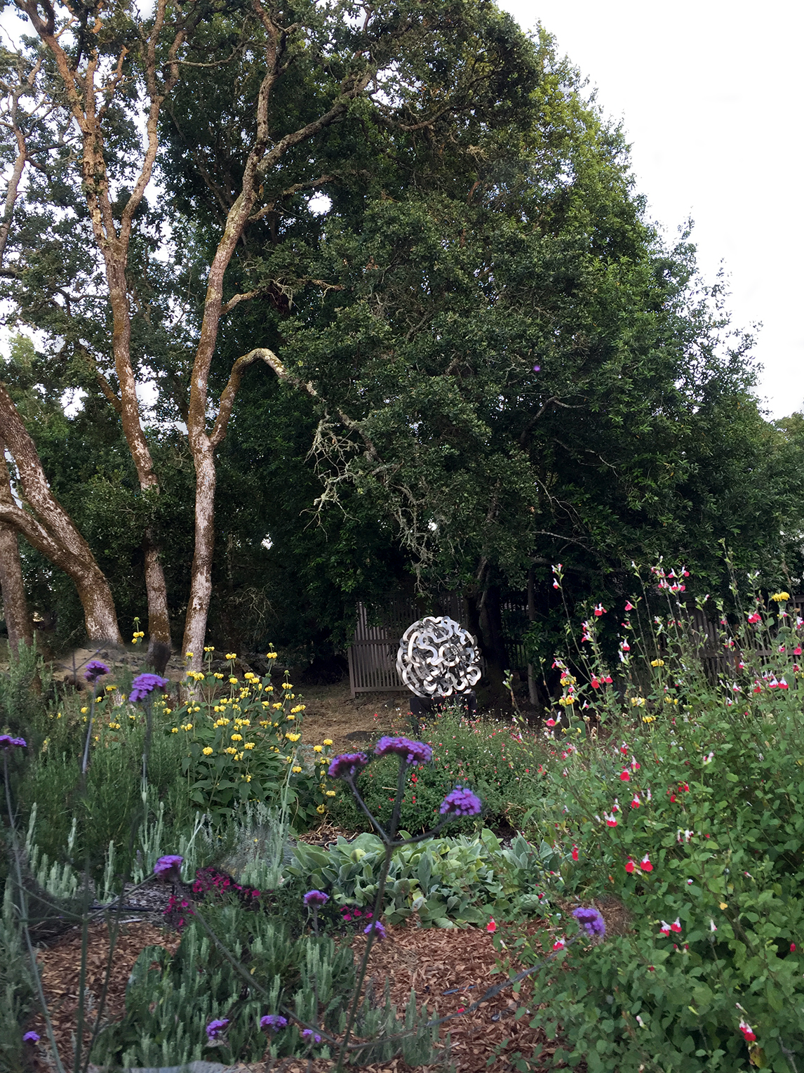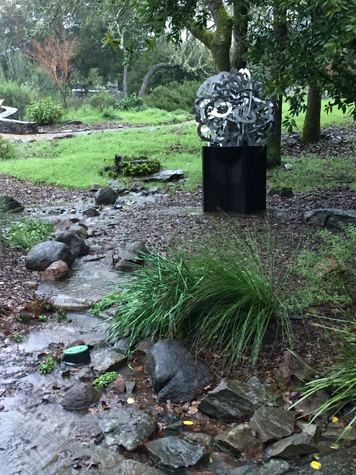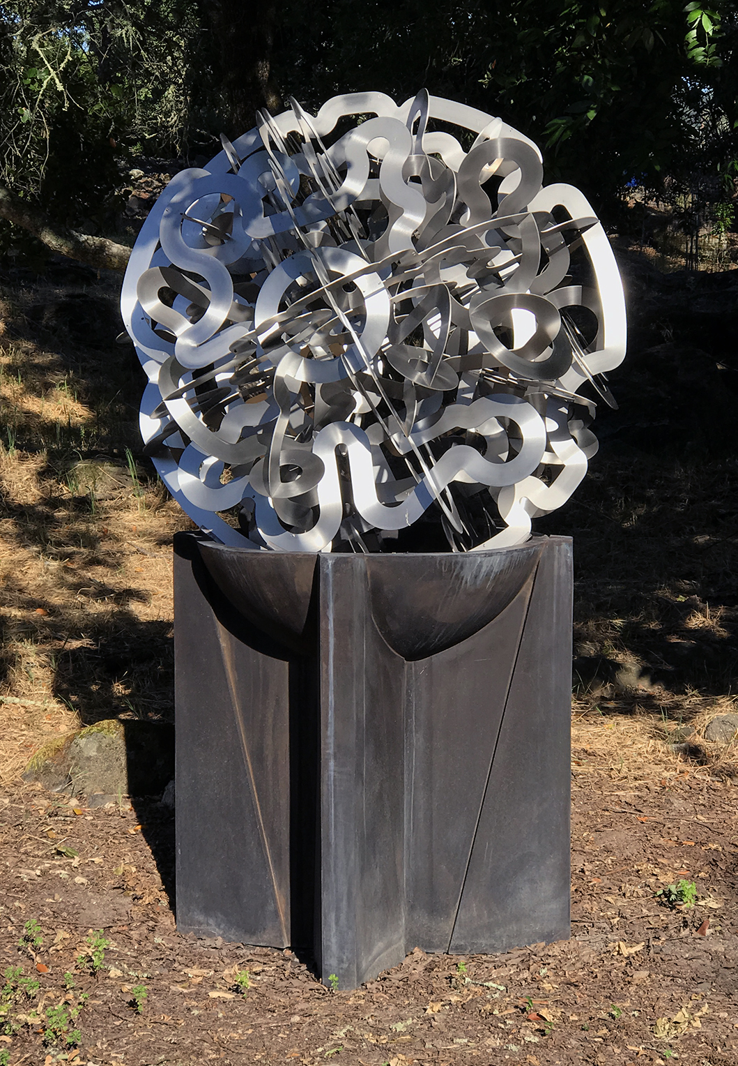 Entwined was commissioned to be in natural surroundings. It is very nearly site-specific, as it was designed to interact with the objects around it as well as with the clients themselves. The scale of the piece competes with trees and other natural forms because although it is only 48″ in diameter, the reflectance of its surfaces creates a dynamic, ever-changing visual display. As the sun rises and falls, atmospheric changes occur, and the plants go through their natural cycles, Entwined picks up and disburses the colors of the world around it. This also occurs as one walks around it.